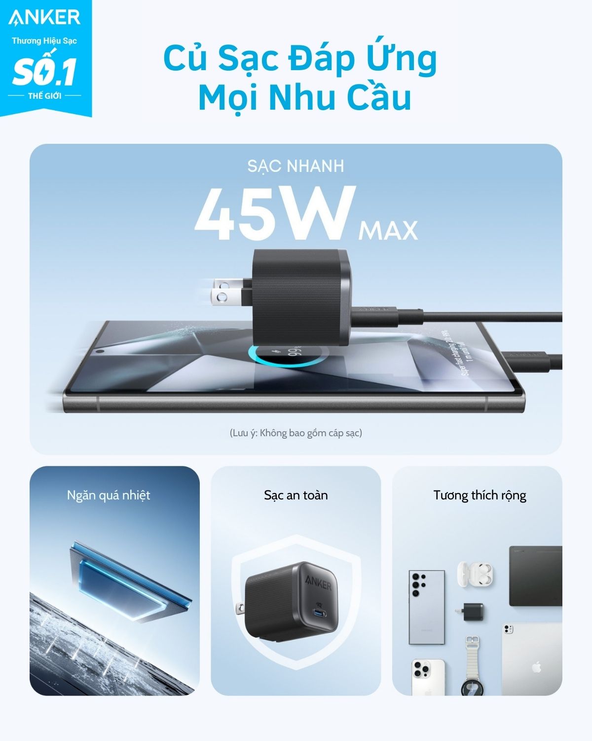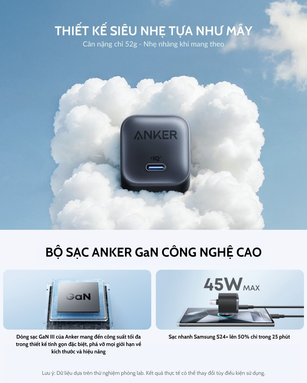 Củ Sạc Nhanh 1C ANKER A2692 45W là phiên bản nâng cấp sử dụng công nghệ GaN III tiên tiến, giúp giảm kích thước nhưng vẫn duy trì khả năng sạc nhanh lên đến 45W. Sản phẩm được thiết kế dành cho người dùng thường xuyên di chuyển, cần một củ sạc gọn nhẹ nhưng có thể nạp nhanh cả điện thoại, tablet và một số laptop nhỏ gọn.
