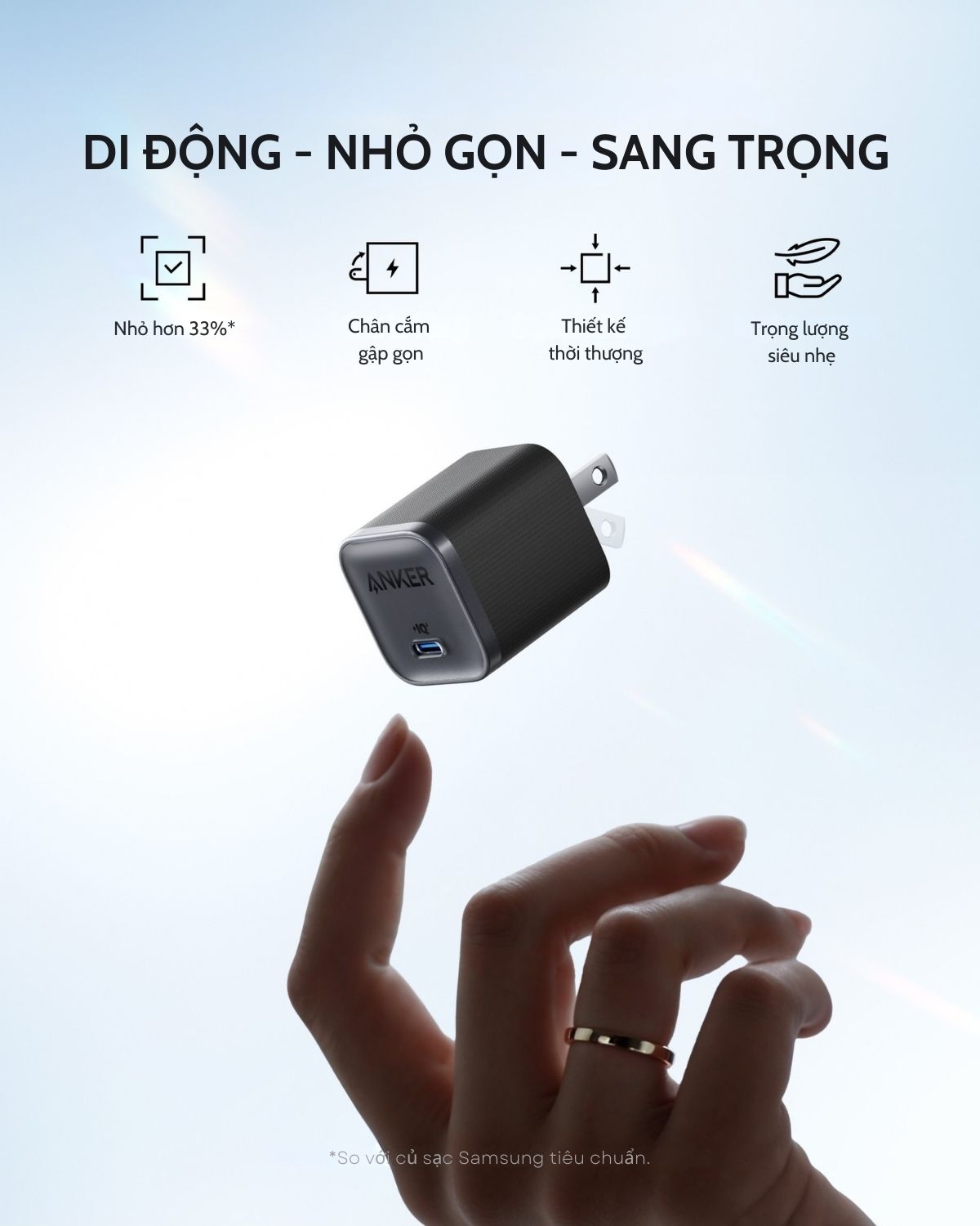 - Kích thước: Anker Nano III 45W chỉ có kích thước khoảng 32 × 32 × 54 mm (khi gập chân), nặng chỉ 62 gram, bằng một nửa so với nhiều củ sạc 45W khác trên thị trường. Kích thước này cho phép bạn dễ dàng bỏ vào túi quần hoặc túi xách mà không vướng víu.