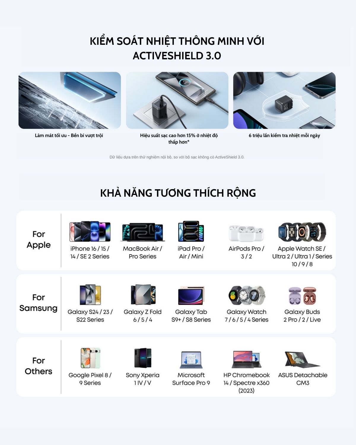 Anker luôn đặt sự an toàn của người dùng lên hàng đầu. Công nghệ ActiveShield™ 3.0 độc quyền của Anker liên tục theo dõi nhiệt độ và điều chỉnh công suất đầu ra để bảo vệ thiết bị của bạn khỏi tình trạng quá nhiệt, quá dòng, đảm bảo quá trình sạc luôn an toàn và ổn định.